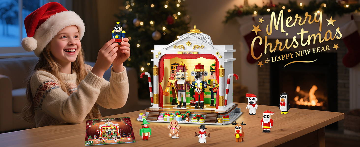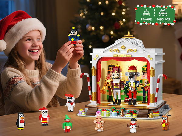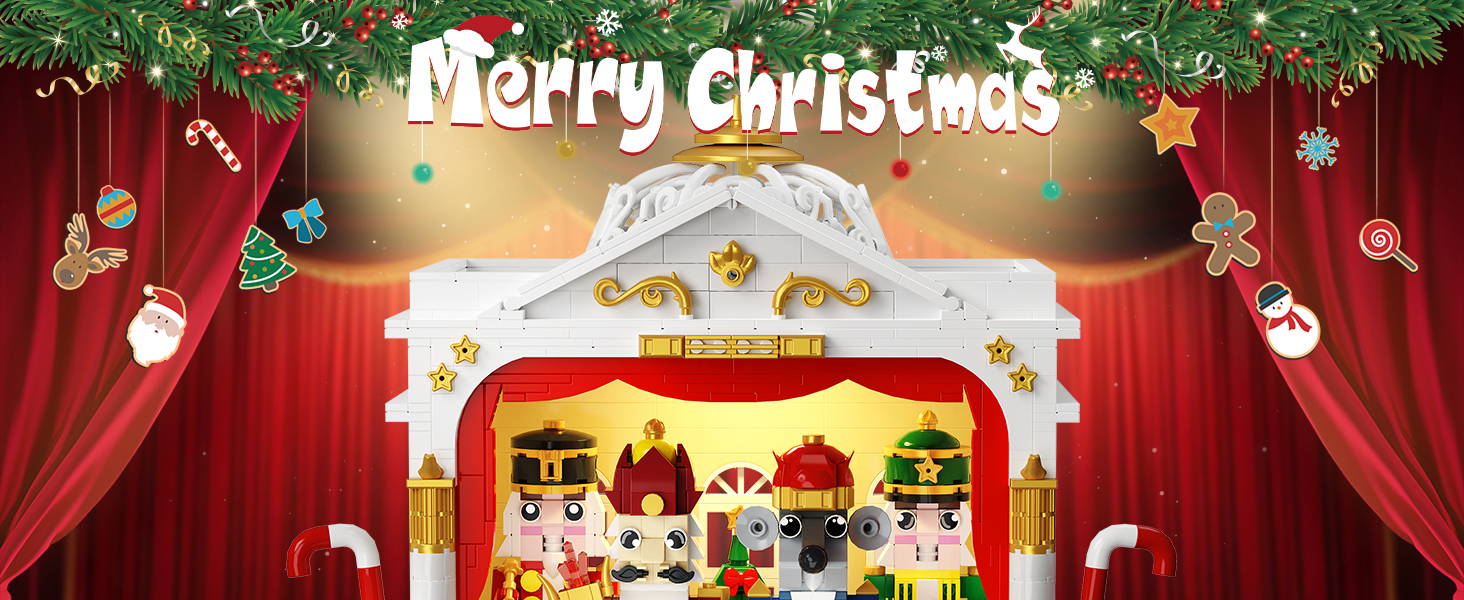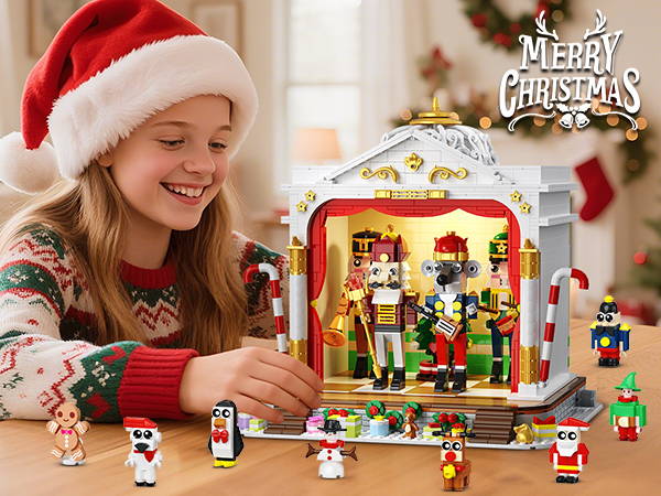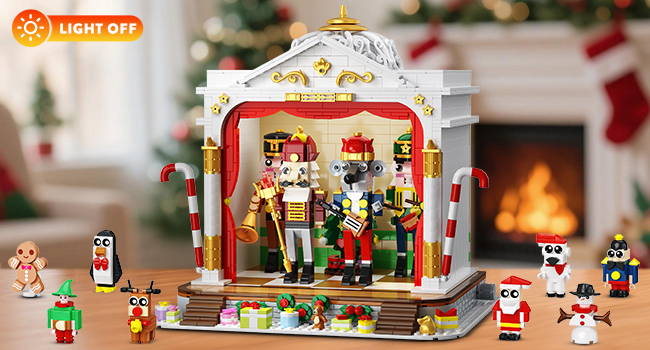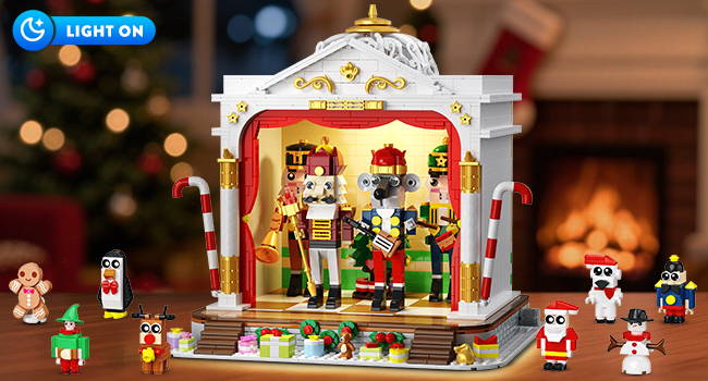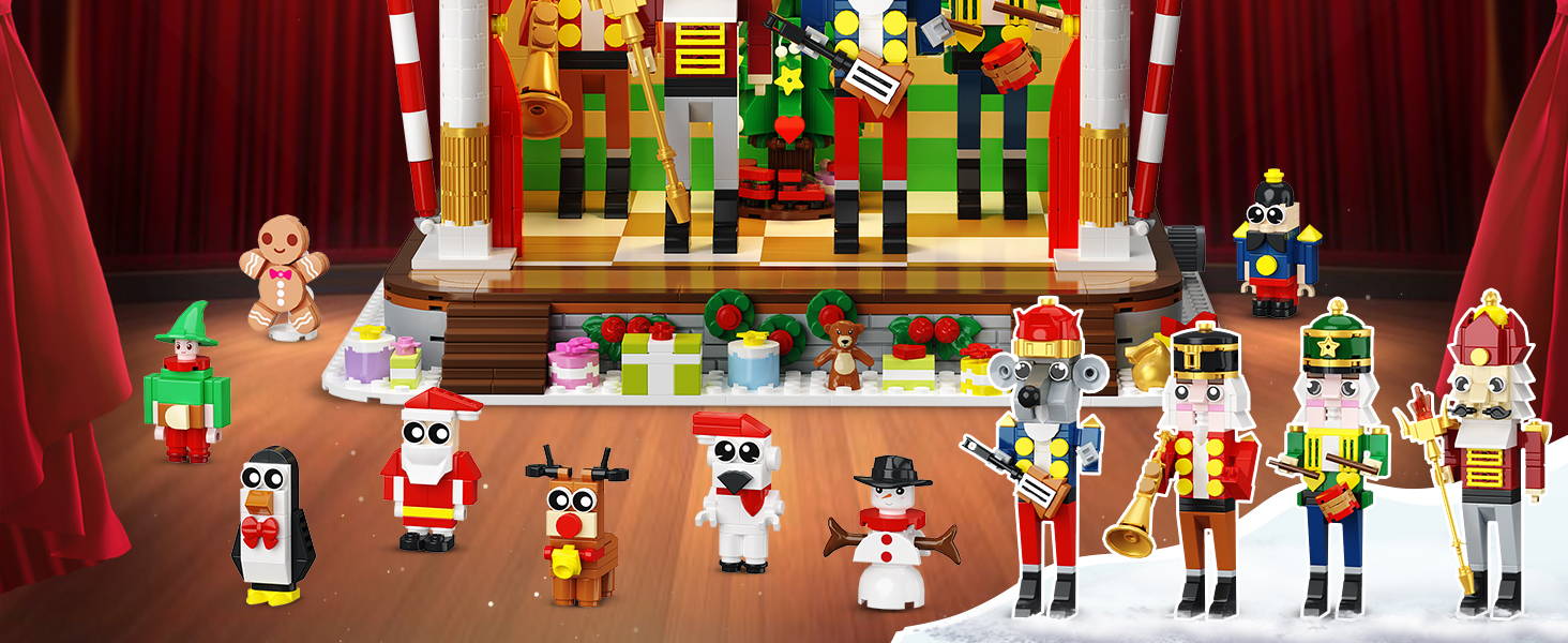 On Christmas Eve, 4 Nutcrackers perform carols in the theater. Their joyful music draws Santa, the Gingerbread Man, the Snowman, and friends - 8 guests in all. Why not join them? Build our Christmas Theater building toy and join the festive gathering this holiday!