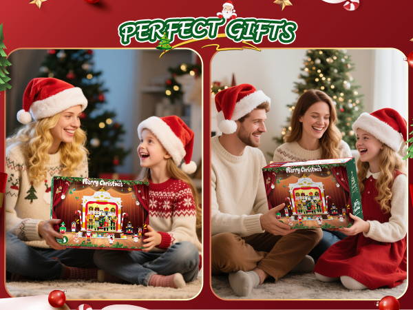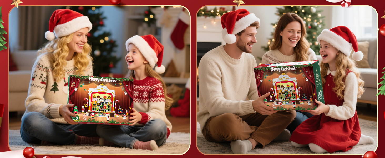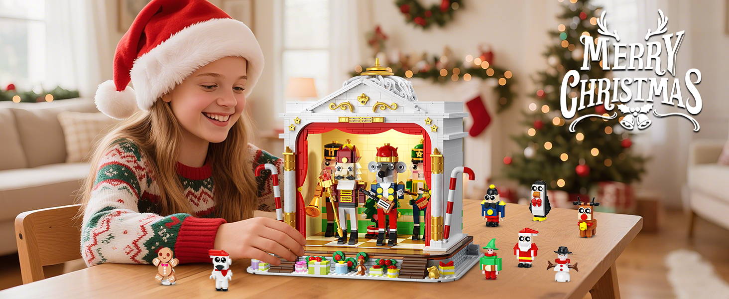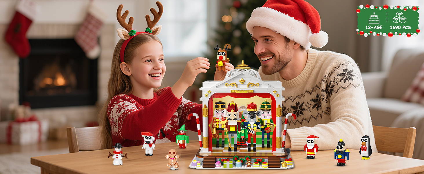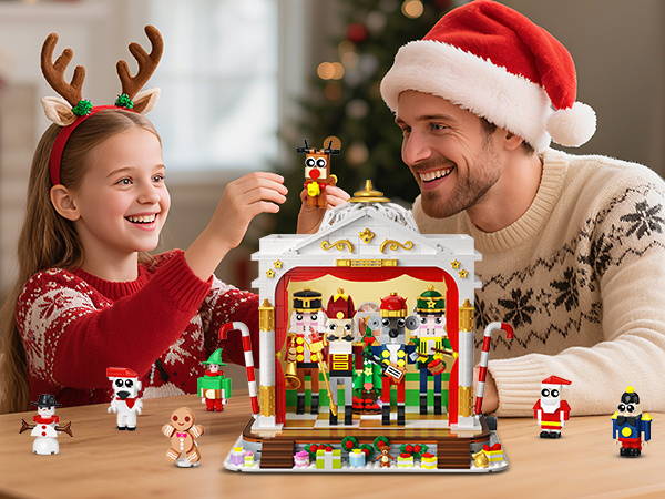 On Christmas Eve, 4 Nutcrackers perform carols in the theater. Their joyful music draws Santa, the Gingerbread Man, the Snowman, and friends - 8 guests in all. Why not join them? Build our Christmas Theater building toy and join the festive gathering this holiday!