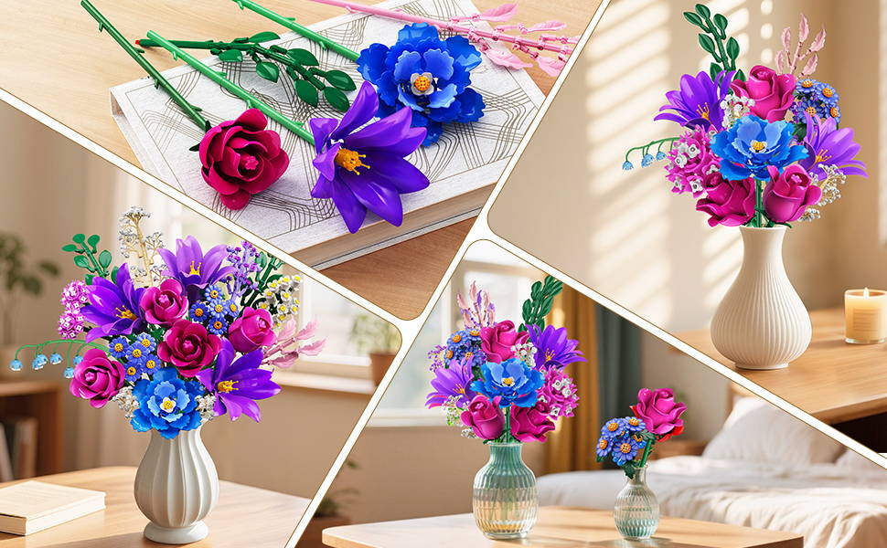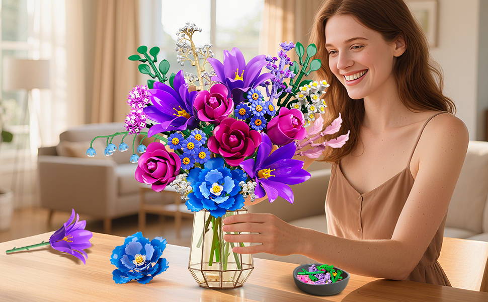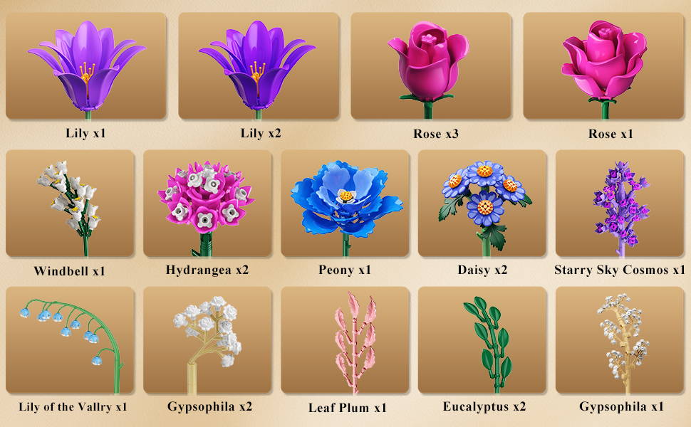 CUBIMANA Valentines Day Flower Bouquet Building Set includes 21 different flowers, such as Rose, Lilies, Daisies, Hydrangeas, Eucalyptus, Gypsophila, Lily of the Valley, Peony, Campanula, and Starry Cosmos, etc. Each flower in this flower botanical collection kit brings the beauty of nature into your home.